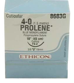• The PROLENE Polypropylene Suture is indicated for use in general soft tissue approximation and/or ligation, including use in cardiovascular, ophthalmic and neurological procedures. The suture is pigmented blue to enhance visibility. Reverse Cutting. Ethicon Needle Type: FS-2. Needle Shape: 3/8 circle. Needle Length: 19mm. Material: Blue Monofilament. Suture Length: 18". Suture Size: 4-0.
