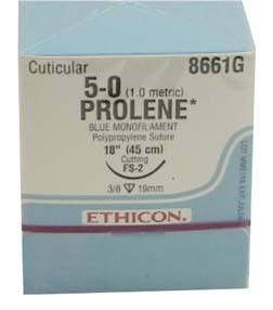 - The PROLENE Polypropylene Suture is indicated for use in general soft tissue approximation and/or ligation, including use in cardiovascular, ophthalmic and neurological procedures. The suture is pigmented blue to enhance visibility. Non-Absorbable. Precision Point - Reverse Cutting. Ethicon Needle Type: FS-2. Needle Shape: 3/8 circle. Needle Length: 19mm. Material: Blue Monofilament. Suture Length: 18". Suture Size: 5-0. Qty. 12/bx.