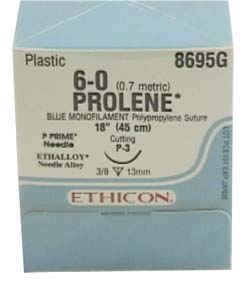 • The PROLENE Polypropylene Suture is indicated for use in general soft tissue approximation and/or ligation, including use in cardiovascular, ophthalmic and neurological procedures. The suture is pigmented blue to enhance visibility. Non-Absorbable. Precision Point - Reverse Cutting. Ethicon Needle Type: P-3. Needle Shape: 3/8 circle. Needle Length: 13mm. Material: Blue Monofilament. Suture Length: 18". Suture Size: 6-0.