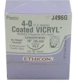- Ethicon's Coated VICRYL (polyglactin 910) Suture is indicated for use in general soft tissue approximation and/or ligation, including use in ophthalmic procedures, but not for use in cardiovascular or neurological tissues. Coated VICRYL suture is a synthetic absorbable sterile surgical suture composed of a copolymer made from 90% glycolide and 10% L-lactide. The sutures are available dyed and undyed (natural). Ethicon Needle Type PS-2; Needle Shape 3/8 circle; Needle Length 19mm; Undyed Braided Material; Suture Length 18in (45cm); Suture Size 4-0; Qty. 12/bx.