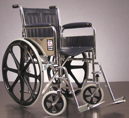 - Everest & Jennings New Traveler, standard wheelchair with padded, burgundy leatherette upholstery and padded armrests. Fixed arms, with swing-away detachable footrests. Adult seat size of 18"w. x 16" d. with a 24" rear wheel and 8" front casters. Chrome finish with durable aluminum footplates. 16.5" back height. Overall wheelchair weight of 36 lbs. 2 year limited warranty on frame and crossbraces. 300 lb. weight capacity. Other sizes available include: narrow, wide and extra-wide.