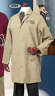 - Unisex Lab Coat. Size: Large. Color: Tan. 41 in. length based on size medium. Button front. Left breast pocket. Two lower outside pockets. Side slits for pocket access. 65% Polyester, 35% Combed Cotton Poplin.