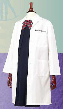 Ladies Traditional Length Lab Coat, White, Size 20, 39 1/2" length. Three patch pockets, two piece back belt. Button front. 65% Polyester, 35% Combed Cotton Poplin.