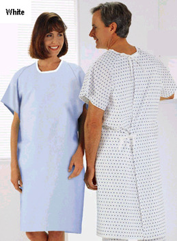 - Basic Patient Gown, White in color, Size Small (Men's 34/36, Ladies 8/10). Tape bound necklines for smoother fit, greater wearability and added comfort. Back ties and all bound necklines are 100% Polyester, all stress points are firmly bartacked, strong extra-wide tape firmly and securely covers neckline. 45" length, 6" spacious insleeve, 55" sweep for coverage. 100% Cotton Linene.