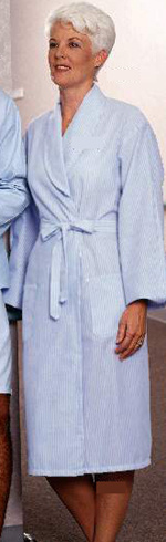 Shawl Collar Robe, Green Stripe, Size Large (Men's 42-44, Ladies 14-16, Waist Size 34-36). Attached belt and two roomy pockets. 65% Polyester/35% Cotton Woven Seersucker.