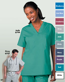 Unisex Set-In Sleeve Scrub Shirt. Color: Jade Green. Size: 3XL. Reversible, color-coded neck binding, left breast pocket on both sides, reinforced v-neck. 50% Polyester, 50% Cotton.