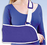 - Universal Arm Sling. Traditional envelope arm sling comfortably distributes the weight of the arm following surgical or non-surgical treatment of the arm, hand or shoulder. Made in a strong, seamless quality design. Fast and simple application with slide buckle adjustment. Comfort padding on shoulder strap. Poly/cotton material. Color: Navy. Measure forearm from elbow to base of little finger. Measure forearm from elbow to base of little finger. Universal 11 - 16".