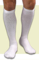 - Moderate Compression Athletic Socks, 20-30 mm Hg, Calf Support Socks. Moderate graduated compression support socks improves circulation and relieves leg fatigue during your active or long day. Also helps prevent cramping of the calf muscles and ankle/foot swelling. Unique CoolMax fiber blend wicks moisture away from the skin for cool, dry wear. Extra padding at the foot and heel provide long-lasting comfort. Non-binding top band, comfort balloon toe and reinforced heel pocket. CoolMax/Nylon/Spandex. Over-the-Calf length. Color: White. Size Large, fits men's shoe size under 10-1/2 to 12.