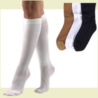 - Sheer Therapy Knee High Stocking, 15-20 mm Hg, Black. Ideal for anyone, this graduated compression hosiery helps prevent leg fatigue, ankle and foot swelling, mild spider veins and varicose veins by improving circulation in the legs. Elegant in its sheerness, this support hose gives comfortable, preventative support while still remaining fashionable. Reinforced toe and heel. Knee High has a non-binding top. Spandex/Nylon.