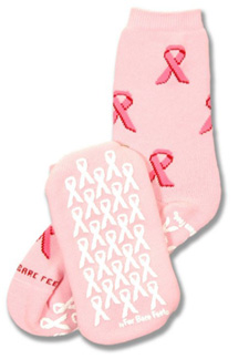 - Breast Cancer Ribbon Slipper Sock. Thin, flat knit, lightweight sock made with 75% acrylic to wick away perspiration, 25% stretch nylon for perfect fit and firm support. Natural anti-bacterial yarn properties help inhibit bacterial growth. Elastic: nylon, latex rubber.