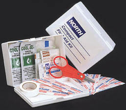 - North Compact First Aid Kit. Unique two-piece box container is an easy addition to glovebox, luggage, briefcase, or purse. Contains 24 first aid products designed for basic first aid needs. Container is made of durable lightweight plastic and measures 2L x 5W x 3-1/4 in.H (5.1 x 12.7 x 8.3cm). In the kit are: eight adhesive bandages (1/4 x 3 in.); two adhesive bandages (extra-large); one roll of adhesive tape (1/2 in. x 2-1/2 yd.); burn ointment (1/8 oz.); compress (2 in. x 6 yd.); six PVP wipes; one pair of scissors; two sterile pads (3 x 3 in.); and a first aid guide.