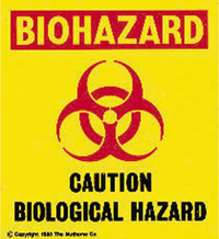 - Caution-Biological Hazard" Adhesive Backed Aluminum Warning Sign. Use to warn personnel of biological hazards in accordance with various federal and state regulations. Warning signs are 10 W x 12 in. H (25 x 30 cm).