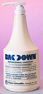 - Bacdown Antimicrobial Hand Soap. Gentle, pleasant-smelling antimicrobial handsoap formulated for frequent use. The active ingredient, triclosan, provides efficacy against a wide variety of gram-negative and gram-positive bacteria as well as yeast and fungi. Will not dry skin. Size/Description: 33 7/8 oz. (1L).