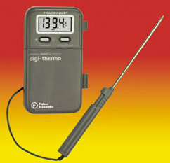 - Fisherbrand Traceable Digital Thermometers With Stainless Steel Probes. Temperature Range: (50-degrees to +260-degrees C) and (-58-degrees to +500.8-degrees F). Resolution: 0.1-degrees. Accuracy: +/-1-degrees. LCD Display: 1/2 in.H (13mm). Probe Type: 1/8 dia. x 7-1/4 in.L (3mm x 18cm) stainless-steel probe on 3 ft.L (0.9m) cable. Traceable. Dual range; HIGH/LOW alarm programmable in 1-degree increments; temperatures exceeding set limits activate 1 min. audible alarm; automatic alarm reset when temperature returns to in-range condition. Runs without alarm mode; with "AAA" battery. 4L x 2W x 1/2 in.H (10 x 5.1 x 1.3cm).
