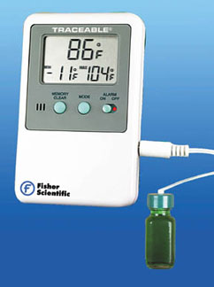 - Fisherbrand Traceable Refrigerator/Freezer Alarm Thermometer. Dual Range: -50 to +70 degrees C, -58 to +158 degrees F. Monitors temperature in freezers, refrigerators, incubators, water baths, and heating blocks. "Temperature-buffered" sensor, sealed in bottled glycol solution, provides accurate reading when freezer/refrigerator doors are open. Triple display simultaneously shows current, high, and low temperatures. Min/max monitors high/low readings overnight, on weekends, or for any time period. Alarm set in 1 degree increments alerts user with visual and audible signals if temperature goes outside setpoints. 10 ft. long (3m) microcable. Solid-state probe eliminates mercury contamination in refrigerators. Includes Velcro and magnetic mounting strip and one "AA" battery. High-impact, chemical-resistant ABS case. Dimensions: 4 1/4" L x 2 3/4" W x 3/4" H (11 x 7 x 2 cm).