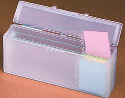 - Fisherbrand Five-Slide Transport. A 50-gauge polypropylene slide container for air conveyors and specimen slide transport between doctor's office and the lab. Holds up to five 3 x 1 in. or 75 x 25mm slides. Ribbed partitions keep slides apart.