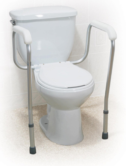 - Toilet Safety Frame. Features: Anodized aluminum is sturdy and lightweight. Waterfall armrests provide additional comfort and support. Powder coated aluminum bracket easily attaches frame to toilet. Arm height and width are adjustable. Limited Lifetime Warranty.