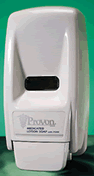 - Provon Wall Dispenser, 1000ml. Description: Portion-controlled, push-bar soap dispenser holds sanitary refill pouches of soaps formulated for use in healthcare environments. Push-bar reinforces the dispenser's attachment to the wall with each use. Bag-in-box refills are germ-free, no-leak, sealed pouches which help prevent contamination and the spread of disease. New dispensing valve included with each refill. Dispenser is ADA compliant and has a manufacturer's lifetime guarantee. Dermatologist tested soaps combine gentle cleansers with emollients and conditioners to protect hands against frequent washing. Holds 1000 ml soap PROVON Brand refills (sold separately). White plastic. 5-7/10w x 5-1/10d x 11-1/5h.