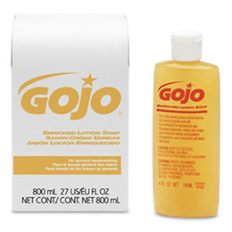 - GOJO Enriched Lotion Soap, 800 mL. For use with Gojo 800 Series Bag-in-Box Dispenser. 12/case. Gentle, natural lotion soap with moisturizers. For general use. Gold color. Pleasant, light fragrance.