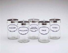 - Sundry Jar, Labeled, Individual Jar with Cover. Imprint: "Bandages". Fine-quality, clear flint glass jar with overlapping, stainless steel cover. Each jar permanently imprinted in blue. Size: 7" x 4-1/4".