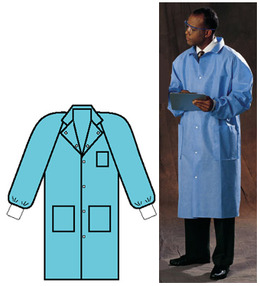 - Lab Coat Universal Precautions with traditional collar and knit cuffs. Features 6 snaps, 3 reinforced pockets, back vent, neck loop for hanging, size/name label. Coat has 3 protective layer fabric. Potential for moderate fluid contact. Available in sizes Petite-XXLG also in blue or white. Xlg-blue. 25/cs.
