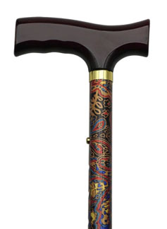 Fashinable Imprints Folding Adjustable Cane. Print: Paisley. Brown wood Fritz handle. Aluminum shaft adjustable from 33 to 37". Rubber tip #28008.