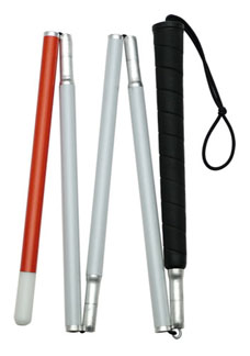 Four Section Folding Cane for the blind. Black rubber grip handle and strap. White shaft is covered with reflector tape for night visibility. Length: 54".