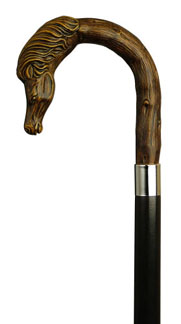 Horse Head Molded Crook Handle Cane. Handle in simulated brown wood tone, made of high impact durable nylon. Black maple shaft. 36" long with steel reinforced suction grip rubber tips.