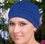 SWIM TURBAN, White. The swim turban is an attractive fabric swim cap (or shower cap) with a plastic liner. The Velcro closure at back provides adjustable sizing. 100% POLYESTER.