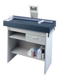 - Hausmann Econo-Line Pediatric Table. Digital scale with easy reading display. Kilo-lbs switch. Auto power shut-off. Electric and battery operation. 9V AC adapter included. Batteries not included (6 "AA). 39" long built-in manual infantometer. One polystyrene drawer and fixed shelf. Paper dispenser and side rail cutter. 43" x 24" x 36" Table.