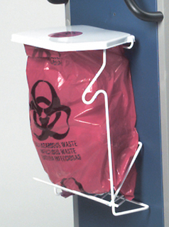 - Rack and Bag Waste Disposal System, 3 Gallon, White. A compact rack that holds waste bags and attaches to walls and cabinet doors, replaces unsanitary waste cans. The hinged lid keeps odors contained. Three pre-drilled holes in the backside helps for mounting, three screws are included. The rack is made of white plastic coated heavy duty wire rod.