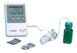 - Traceable Memory Monitor Thermometer: This refrigerator/freezer thermometer has a minimum maximum memory feature the permits monitoring conditions overnight or weekends or for any time period. Triple display for current high, and low temperatures. The thermometer has an alarm that may be set in one increments, the alarm sounds when the temperature reads above or falls below thw set points. The alarm continues to sound for up to 12 hours even if the temperature returns to non-alarm range. Traceable Memory Monitoring can be used in monitoring liquids, air gas, or semi-solids in water baths refrigerators or freezers. The user can set from Fahrenheit to Celsius.