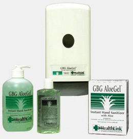 - GBG AloeGel Instant Hand Sanitizer, 18 oz pump dispenser. 12/case. In today's fast-paced healthcare environment, compliance with hand washing guidelines is a challenge. Let new GBG AloeGel solve the problem. GBG AloeGel is a readily accessible, effective, yet gentle hand sanitizer. No soap, water, or towels? No problem! When you can't wash or between washings, apply AloeGel liberally to unsoiled hands and rub in thoroughly. It's that easy! AloeGel provides broad-spectrum antimicrobial activity, killing 99.9% of harmful microorganisms in 15 seconds. Effective against Salmonella typhi, Staphylococcus aureus, Pseudomonas aeruginosa, Streptococcus faecalis, Escherichia coli, Candida albicans, and other related organisms. Even effective against MRSA and VRE! AloeGel contains moisturizers and skin conditioners including vitamin E and aloe, to help prevent drying, cracking, or irritation of the skin. The unique formula helps soften hands, yet leaves no sticky residue.