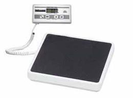 - Two piece digital scale with remote LCD display. Floor scale operates by an Ac Adapter or 9 volt battery. High capacity 400 lb maximum weighing capacity and .2 pound graduations. Platform is 12" x12 " includes rubber mat. Weight is displayed in pounds or kilograms. 18 gauge steel construction with baked white enamel finish. Carrying case available sold seperate (Model 647741)