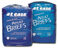 - Hospital Specialty Company "At Ease", adult, disposable briefs in "Special" absorbancy for light to moderate incontinence. Ammonia neutralizing super absorbent polymer reduces odor and protects skin. Diamond-embossed fluff wicks and locks moisture away from skin for maximum performance. Refastenable tape tabs are excellent for bladder/bowel training programs. Full wing, contoured shape for a close, comfortable and personal fit. Elastic leg gathers for leakage protection, and soft, inner lining prevents rubbing against delicate skin. Visual wetness indicator. Color coded sizing for easy inventory control and application. Cloth-like cover feels more like clothing and reduces noise. Size medium fits hip size 32-44" 24/bag 4bags/cs White color code