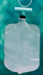 Disposable drainage bag with a tee adaptor which accepts standard 22 mm inside diameter corrugated tubing. 750 cc bag capacity. Self-locking plastic chain secures bag to a stable object. Convenient drainage port.