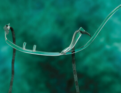 Pediatric cannula with nonflared nasal tips. Soft, transparent vinyl. Adjustable elastic band for comfortable, snug fit below the ears. Complete with 7ft. oxygen supply tubing.
