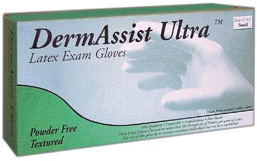 DermAssist Ultra Non-Sterile Latex Powder-Free Exam Gloves, size X-Small (5-1/2 to 6). Unique micro-chlorination process results in consistently excellent donning, a soft, comfortable fit and excellent elasticity. Slightly tacky exterior finish provides superior gripping characteristics. Textured Finish. Beaded cuff for added strength, easier donning and protection from liquid runs.