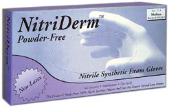 - NitriDerm Purple Non-Sterile Nitrile Powder-Free Exam Gloves, size Medium (7-1/2 to 8). Medium modulus nitrile synthetic glove has a "firm" feel. Dons wells and provides excellent tactile sensitivity. Slightly tacky exterior finish provides excellent gripping properties. Textured Finish. Length: 9.5". Finger thickness: 0.12mm. Better fit than vinyl.