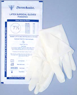 DermAssist Sterile Latex Powdered Surgical Gloves, size 8. These gloves exceed the standards for all general surgical applications. Bisque (lightly roughened finish) surface provides a sure grip whether wet or dry.