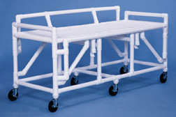 - Transport Shower Gurney for larger patients. 1-1/2" PVC for added strength. Drop side rails for patient safety. Use for patient transport and/or shower gurney. 6 heavy-duty 5" hooded casters (4 locking). Pad optional. 77-1/2" long x 33-1/2" wide x 35" high. 450 lb. capacity.