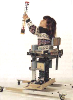 - Small Vertical Stander, Model VS1C. Designed as positioning aids for users who do not have adequate balance to stand independently and who need lower body support to attain alignment while standing. For users 18 months to 9 years. Pelvic Stabilizer: Inside depth adjusts 3.5" to 8.5". Inside width adjusts 5" to 11.25". Swings open for access to stander. Base width: 20". Retractable base to fit against counters. 2", locking, swivel casters fit under counter toe-space. Base length when fully extended: 29.25" Removable, height-adjustable knee cushion: 5"H x 14"W. Removable, height-adjustable thoracic support. Shoe clamps adjust to angle the user's toes in or out.