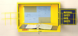 - Hazard Information Center, 20"H x 32"W x 8-1/4"D. Protects Information Indoors and Out. Allows convenient storage of important emergency materials, MSDS binders and floor plans, either in the workplace or on the job site. Weather-resistant center keeps documents dry and intact. All-welded steel cabinet equipped with waterproof MityLite penlite with magnet and two AAA batteries, two swing-out binder racks and plastic sheet with magnetic perimeter for securing maps. Cover swings down to create a handy desktop. (Binders are sold separately - LBSS1A-48753Y).