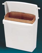 Sanitary Napkin Receptacle. White plastic with removable rigid liner for easy cleaning. Includes five waxed paper liner bags. 12-1/2w x 5-1/4d x 10-3/4h.