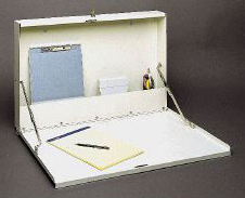 - Wall Desk Cabinet, Manual Close. For use in offices and exam rooms when records and charts are needed and space is at a premium. High security cam lock, heavy duty 16 gauge construction, single pocket across desk. Dimensions closed: 27"W X 18"D X 4"H. Writing surface: 27"W X 18"D. Weight: 26 lbs. Color: Autumn white.