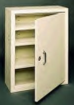 - Beige, Wall mounted Single Door Narcotic Cabinet with one fixed shelf and two adjustable shelves. Heavy 18 gauge steel exterior: Coded tubular cam lock for superior strength and security. Includes mounting hardware. 24"W X 30"H X 10"D