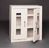 • Beige Medical Storage Cabinet. Two shelves per cabinet, one fixed and one adjustable. Two doors with one clear acrylic window each. 12"D X 24"W X 26"H