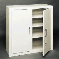 - Medical Storage Cabinet, Autumn White. High security cam lock. Constructed of strong 22 gauge steel. Can be wall-mounted or set under work station. Spring clip door latch. One fixed shelf, two adjustable shelves. Overall dimensions: 30"W X 10"D X 30"H. Weight: 38 lbs.