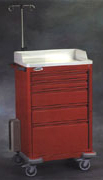 - 5 Drawer Medical Emergency Cart, Red, 43"H X 22"D X 26.5"W. Heavy duty steel construction with electronically welded seams. Built-in side shelf slides in and out for quick access. Built-in push handle maximizes cart mobility. Built-in stabilizing base prevents accidents. Full length drawer pulls simplify opening the drawers. Key lock or tamper-proof seal. Electronic lock available. Premium 5" donut-shaped casters make this cart easy to maneuver (2 locking, 2 swivel).