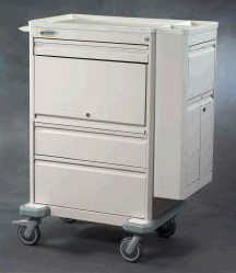 - 24 Patient Capacity Medication Cart. Built-in side shelf that slides in and out for quick access. Built-in push handle. Lockable side cabinet. ABS plastic top. Built-in stabilizing base. Key lock. Overall size: 43"H X 22"D X 32"W. 1 -3" drawer, 1 -6" drawer, 1 -9" drawer, 24 patient bins with 48 dividers, and 1 -3" narcotics box.